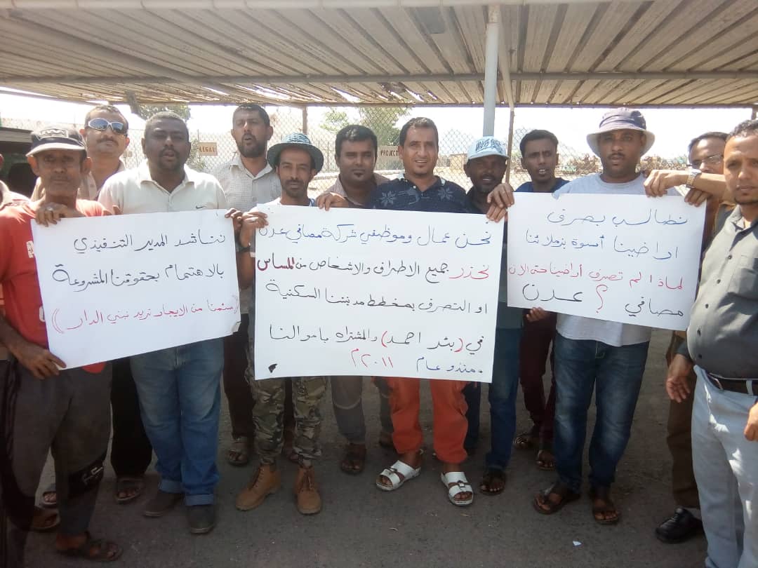 نظم عمال وموظفي شركة مصافي عدن وقفة احتجاجية يوم الاثنين الموافق 5/11/2018 لمطالبة الجمعية السكنية لاراضي ومساكن عمال وموظفي شركة مصافي عدن بسرعة صرف المخطط السكني الكائن في بئر احمد.