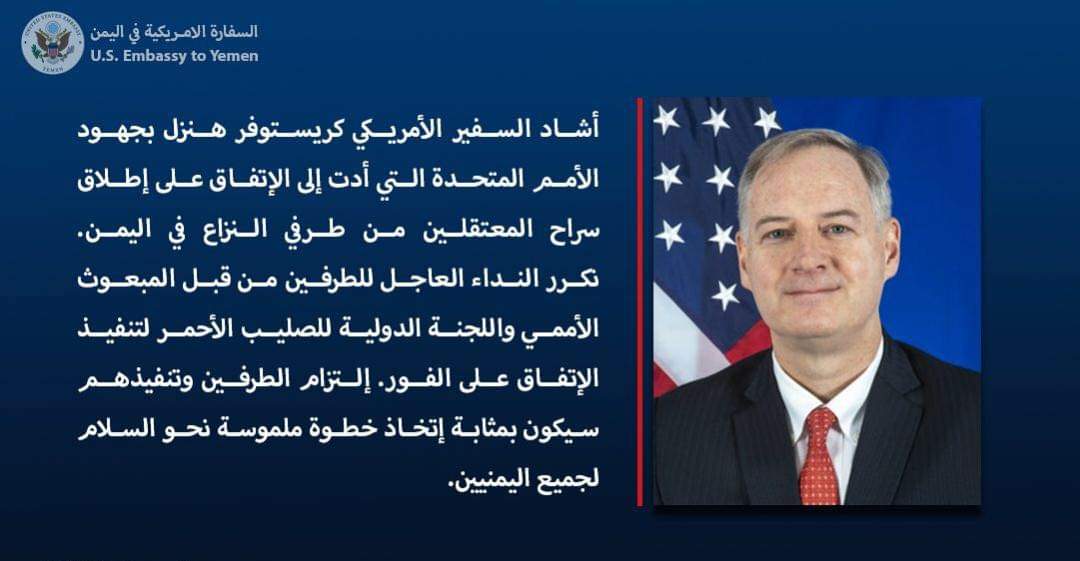 دعا السفير الأميركي لدى اليمن إلى التطبيق الفوري لاتفاق تبادل الأسرى.