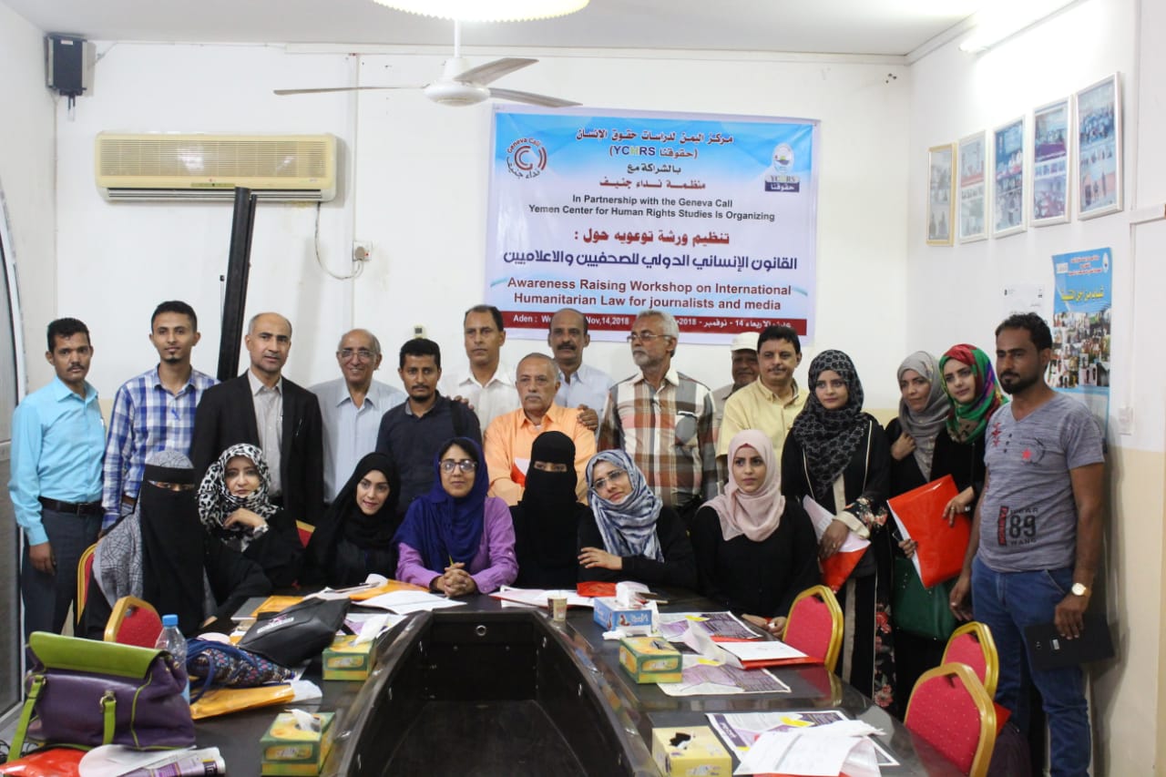 نظم مركز اليمن لدراسات حقوق الإنسان بالشراكة مع منظمة نداء جنيف اليوم الأربعاء الموافق 14 نوفمبر 2018.. ورشة عمل حول القانون الدولي الإنساني، وخصصت هذه الورشة للصحفيين والاعلاميين والكتاب ونشطاء المواقع الإلكترونية ومواقع التواصل الاجتماعي تأكيد على أهمية دور الصحافة والصحفيين والإعلام والإعلاميين والكتاب في تعميم وشرح ما يحمله القانون الدولي الإنساني ونشر مبادئه واهدافه وبالذات في البلدان التي يعتمل فيها حروب وصراعات ومواجهات مسلحة..