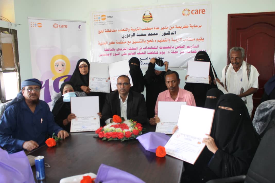 وفي الحفل الذي اقيم بالتنسيق مع منظمة كير العالمية تضامناً مع حملة 16 يوم لمناهضة العنف القائم على النوع الإجتماعي.. القى الدكتور محمد سعيد الزعوري مدير مكتب التربية والتعليم بالمحافظة كلمة هنأ في مستهلها المعلمات المكرمات مبيناً ان قلة الإمكانات تحول دون تكريم الكثير من المعلمين والمعلمات الذين قضوا شبابهم في خدمة التعليم..