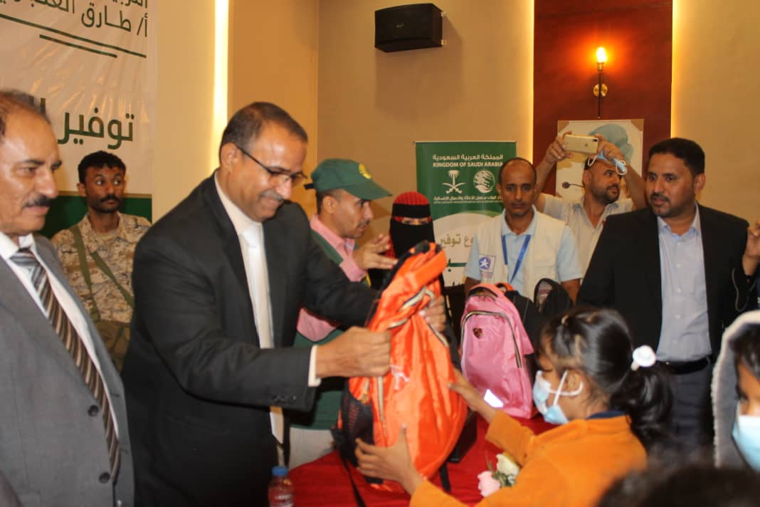 دشن صباح اليوم بالعاصمة عدن توزيع الحقيبة المدرسية للأطفال في محافظات لحج وابين والضالع بدعم من مركز الملك سلمان للإغاثة بحضور معالي الدكتور محمد سعيد حسن الزعوري وزير الشؤون الإجتماعية والعمل في حكومة المناصفة واللواء ابوبكر حسين محافظ محافظة ابين واللواء علي مقبل صالح محافظ محافظة الضالع وبرعاية كريمة من معالي وزير التربية والتعليم.