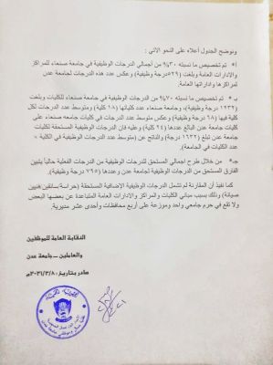 كما تم تخصيص مانسبته( ٧٠% )من الدرجات الوظيفية في جامعة صنعاء للكليات بلغت(١٢٣٢) درجة وظيفية علماً بأن جامعة صنعاء بلغت عدد كلياتها (١٨) كلية ومتوسط عدد الدرجات لكل كلية (٦٨) درجة وظيفية وعكس متوسط عدد الدرجات في كليات جامعة صنعاء على كليات جامعة عدن البالغ عددها(٢٤) كلية ولذلك فأن الدرجات الوظيفية المستحقة لكليات جامعة عدن( ١٦٣٢) درجة و الناتج عن متوسط عدد الدرجات الوظيفية في الكلية هو عدد الكليات في الجامعة .