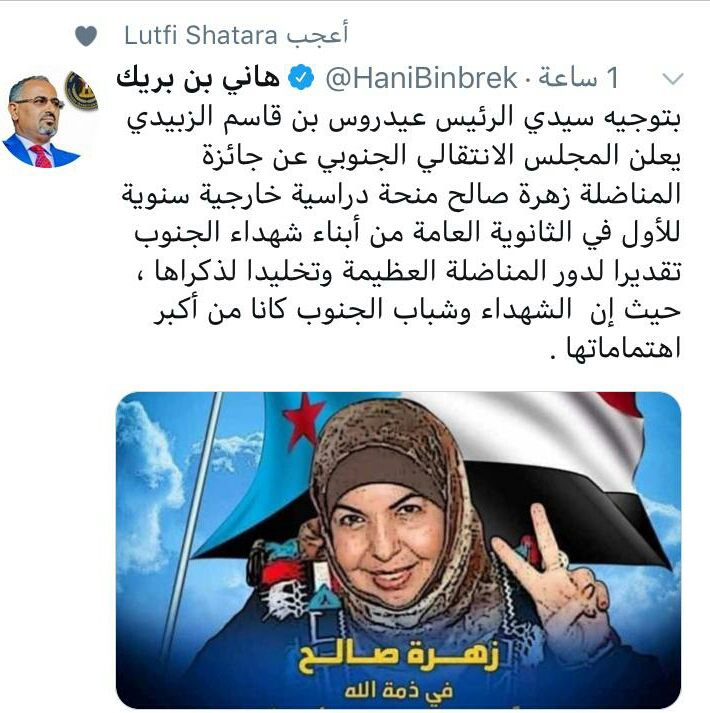 جاء ذلك في تغريدة على صفحته في تويتر ، قال فيها : “بتوجيه سيدي الرئيس عيدروس بن قاسم الزبيدي يعلن المجلس الانتقالي الجنوبي عن جائزة المناضلة زهرة صالح منحة دراسية خارجية سنوية للأول في الثانوية العامة من أبناء شهداء الجنوب تقديرا لدور المناضلة العظيمة وتخليدا لذكراها ، حيث إن الشهداء وشباب الجنوب كانا من أكبر اهتماماتها”.