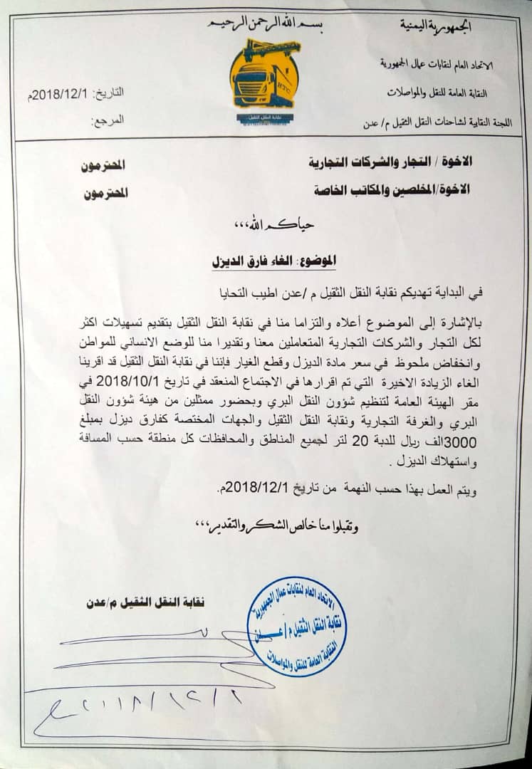 وفي تصريح لرئيس نقابة النقل أبوبكر سالم الكازمي تحدث قائلاً شهد وضع بلادنا الاقتصادي ارتفاع في سعر العملة الصعبة مما أدى الى ارتفاع سعر مادة الديزل وقطع الغيار مما اضطررنا في مكتب الفرزة بالنقابة الي رفع فارق ارتفاع الديزل في اجور النقل في شهر اكتوبر من هذا العام ومع انخفاض العملة مقارنة بالريال اليمني في هذه الايام ساهم في خفض سعر الدبة الديزل 20 لتر من 11الف الى 7الف ريال وايمانا منا بدور الرقابة الذاتية وحرصا علي الوضع الاقتصادي في البلاد و الحالة المعيشية الصعبة التي يعيشها المواطن اليمني واجب علينا الغاء فارق الديزل من بداية ديسمبر 2018م ونحاول بقدر استطاعتنا تقديم التسهيلات لجميع التجار والشركات والمستفيد الاول من هذه التسهيلات هو المواطن.