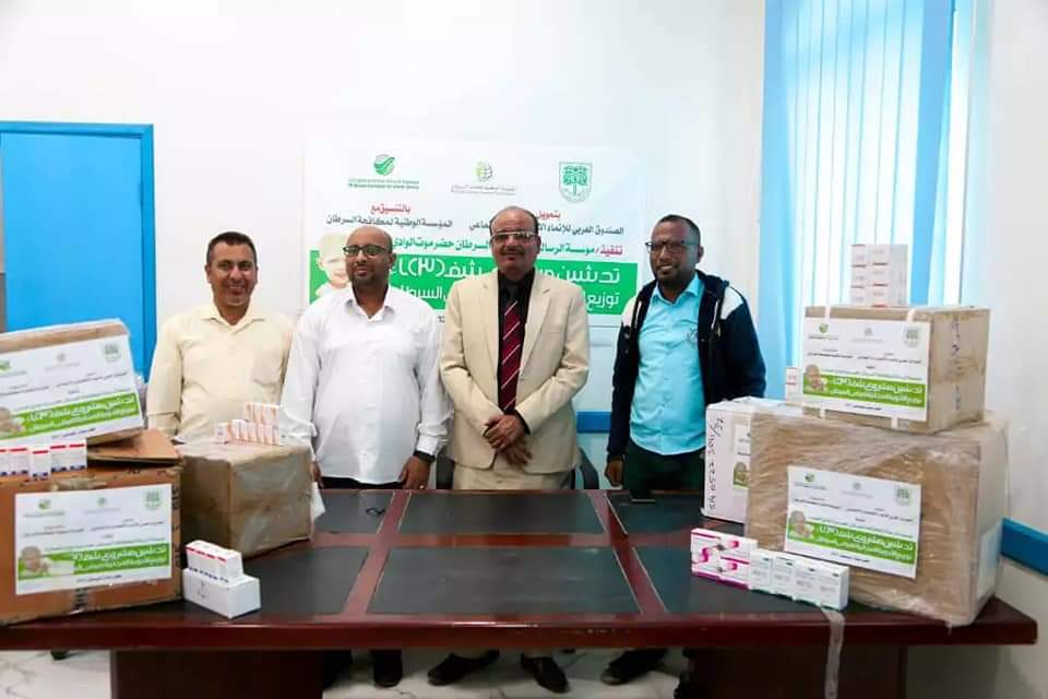 دشنت مؤسسة الرسالة لمكافحة السرطان بحضرموت تدشين مشروع شفاء(٣) لتوزيع الأودية المجانية مرضى السرطان بحضرموت بتمويل من الصندوق العربي للإنماء الاقتصادي والاجتماعي بالتنسيق مع المؤسسة الوطنية لمكافحة السرطان .