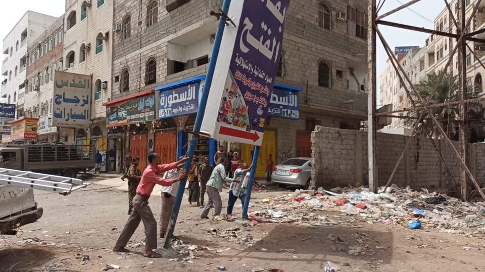 دشن في مديرية المنصورة بمحافظة عدن، أعمال حملة إزالة اللوحات الإعلانية والدعائية لأصحاب المحال التجارية والشركات الإستثمارية غير المرخصة وغير المسددة للرسوم المالية.