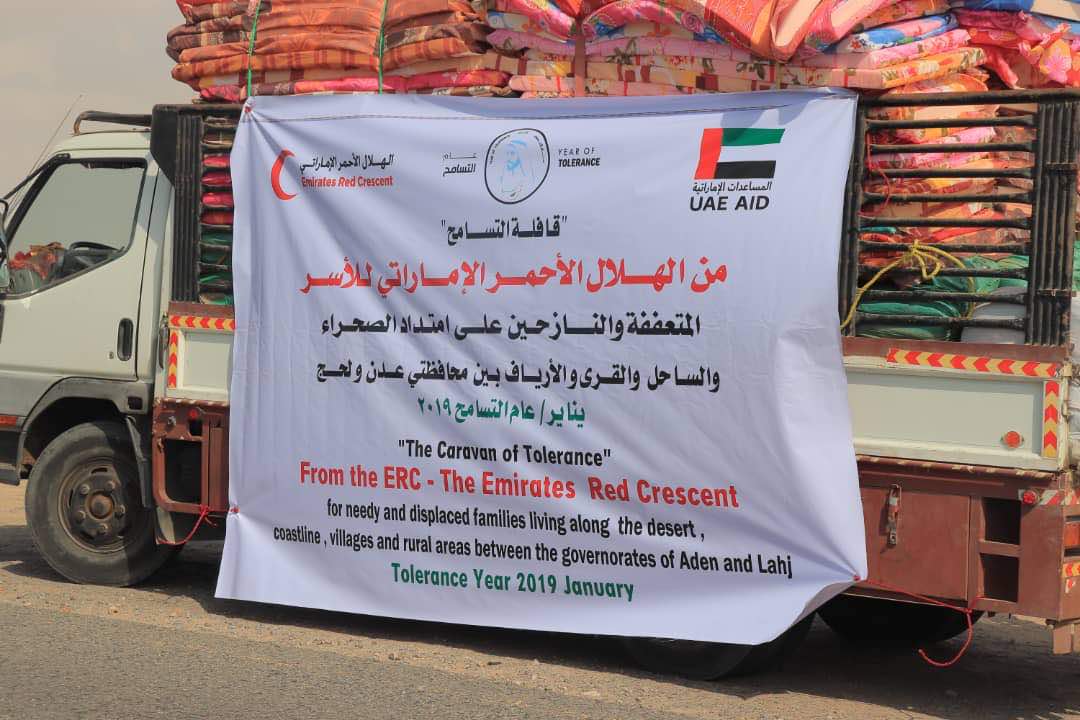 وزعت هيئة الهلال الأحمر الإماراتي مواد غذائية وإيوائية ، للأسر المتعففة والنازحين والبدو الرحل في قرى عمران ، الزجاج ،الكدف ،البيضاء، الكود، الواقعة غرب عدن ، ويأتي امتداد واستمرار لقافلة التسامح المقدمة من هلال الإمارات ضمن أنشطة عام التسامح 2019 ، وتستهدف السكان القاطنين على امتداد الصحراء والساحل والأرياف بين محافظتي عدن ولحج .