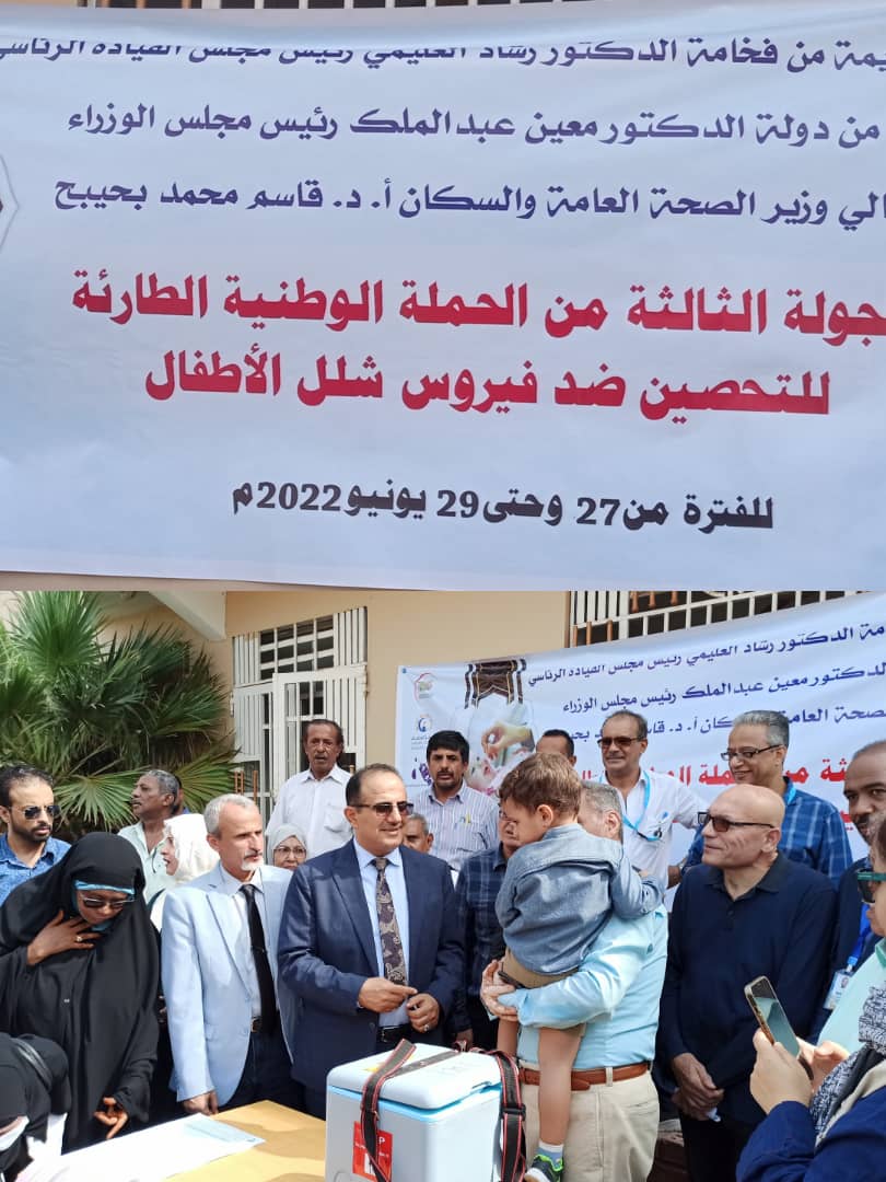 برعاية كريمه من الدكتور رشاد العلمي رئيس مجلس القياده الرئاسي واشرف من دولة الدكتور معين عبد الملك رئيس مجلس الوزارء دشن اليوم الاثنين في وزارة الصحة العامة والسكان ا/الدكتور قاسم محمد بحيبح بالعاصمة عدن وبدعم من شركاء القطاع الصحي لتنفيذ فعاليات الجولة الثالثة من حملة التحصين ضد شلل الاطفال في عدد من المحافظات