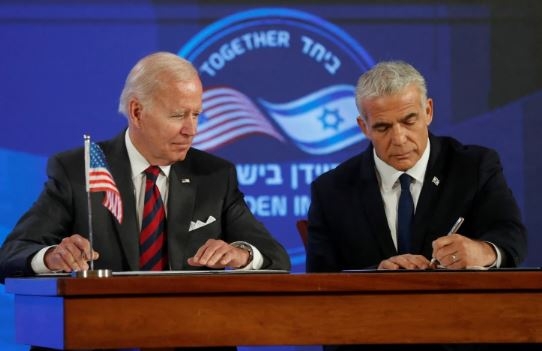 اجتمع قادة الولايات المتحدة وإسرائيل الرئيس جو بايدن ورئيس الوزراء يائير لبيد في القدس في 14 يوليو/تموز 2022، واعتمدا الإعلان المشترك التالي بشأن الشراكة الإستراتيجية بين الولايات المتحدة وإسرائيل: