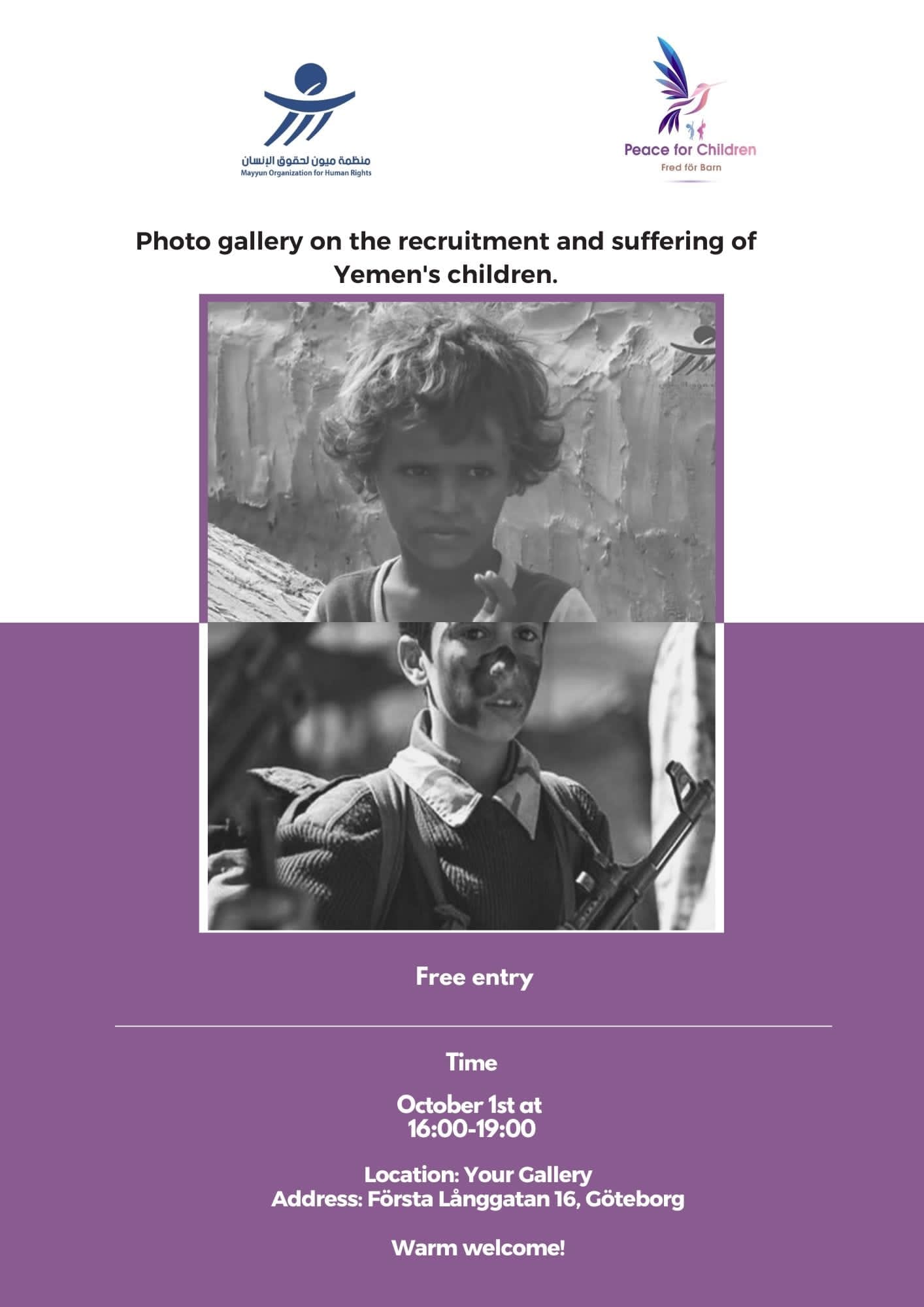 تقيم منظمتا السلام للأطفال وميون لحقوق الإنسان غد السبت معرضاً للصور في مدينة غوتنبرغ السويدية لضحايا الألغام وتجنيد الأطفال في اليمن.