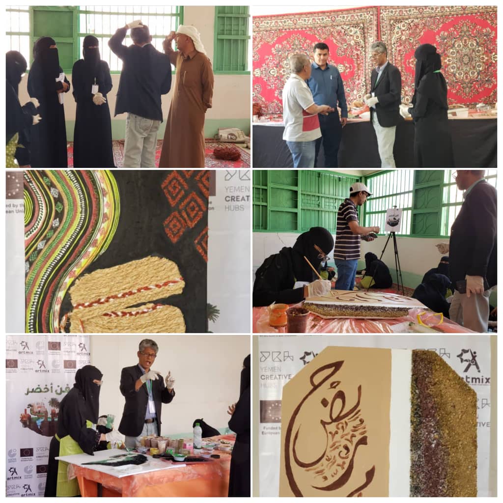المرحلة الأولى للمشروع في مديرية سيئون أختتمت اليوم بعد خمسة أيام من الفعاليات والأنشطة المكثفة لتدريب وتأهيل الفنانات التشكيليات لإنتاج المواد والأدوات والأعمال الفنية من الأوليات المتوفرة في الطبيعة إضافة إلى إعادة تدوير مخلفات البيئة المحلية .