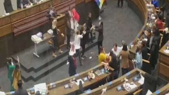 وعلى الأثر هاجمت مجموعة من نواب الأغلبية اليسارية النائبات في محاولة لانتزاع لافتاتهم. واستمر التدافع عدة دقائق قام خلالها النواب بصفع بعضهم البعض، كما قاموا بشد شعر بعضهم البعض وتبادلوا اللكمات.