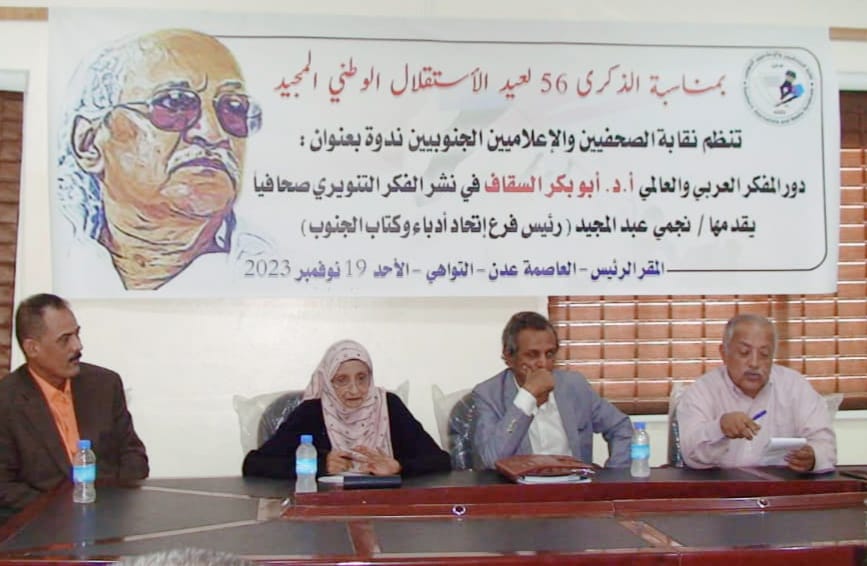 عقدت اليوم بمقر منظمة الصحفيين الاعلاميين الجنوبيين بمديريه التواهي بالعاصمة عدن ندوه بعنوان دور المفكر العربي الفقيد ابو بكر السقاف الذي ساهم في نشر الفكر التنويري على مختلف الاصعده الاعلامية لاسيما الصحافة حيث قدم هذا الكاتب نجمي عبد المجيد رئيس فرع الاتحاد ادباء وكتاب الجنوب