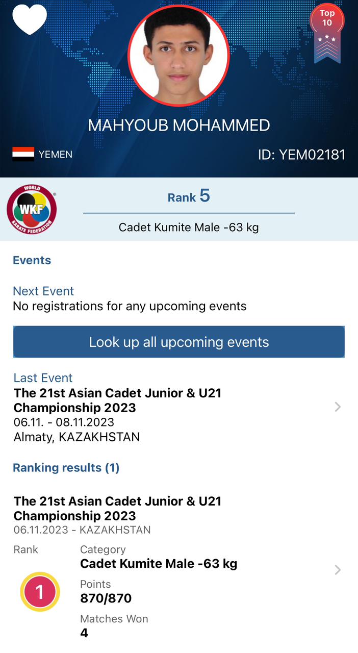وحقق لاعب منتخبنا الوطني للكاراتية محمد معاذ مهيوب المركز الخامس عالمياً لفئة الناشئين أثر تحقيقه ذهبية آسيا للناشئين تحت وزن 63 كجم. التي أقيمت في كازاخستان.