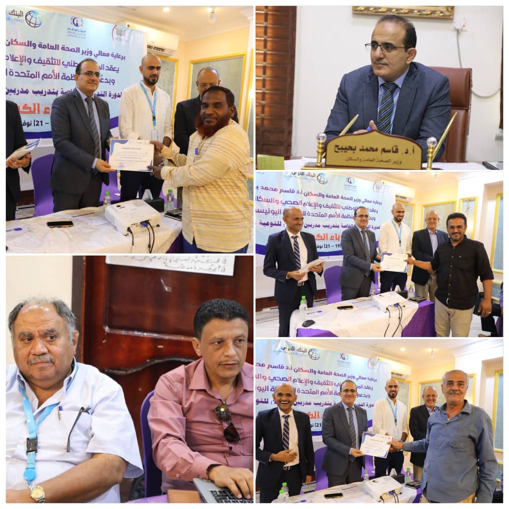 وكانت الدورة التي نظمها المركز الوطني للتثقيف والإعلام الصحي والسكاني وبدعم من منظمة الأمم المتحدة ومنظمة اليونيسيف قد زودت المشاركين على مدى ثلاثة أيام بعدد من المهارات التي تجعل منهم مدربين في المجالات التوعوية الصحية .