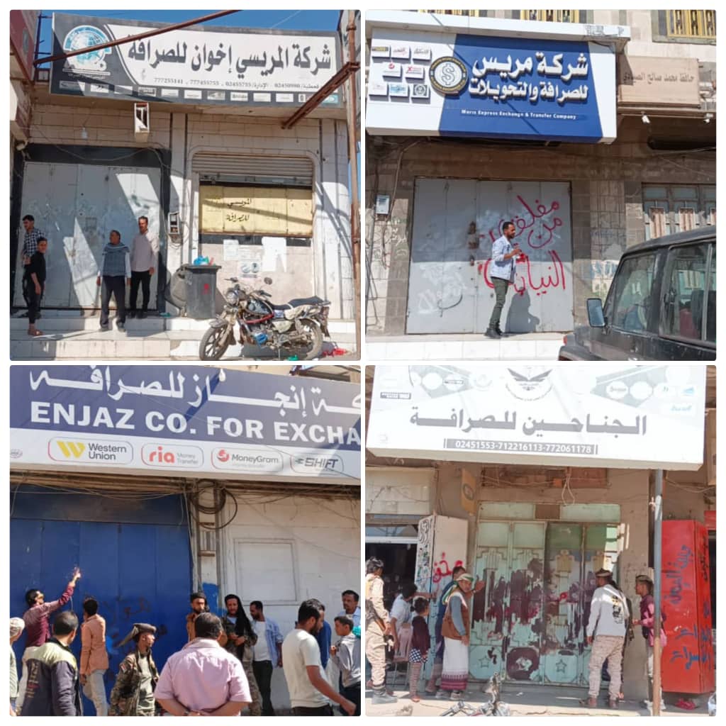 تحت اشراف مباشر من قبل القاضي علي علي الجمل وكيل نيابة الاموال العامة م الضالع وبحضور رئيس وفريق قسم الرقابة على البنوك بقيادة بسام الجعفري رئيس قسم الرقابة والتفتيش بفرع البنك المركزي الضالع نفذت نيابة الاموال العامة بمعية قوات الحزام الأمني بمحافظة الضالع اليوم السبت الموافق 16 نوفمبر حملة لاغلاق عدد من محلات الصرافة المخالفة بمديرية قعطبة بمحافظة الضالع وذلك تطبيقا لإجراءات البنك المركزي ضد المصارف المخالفة.