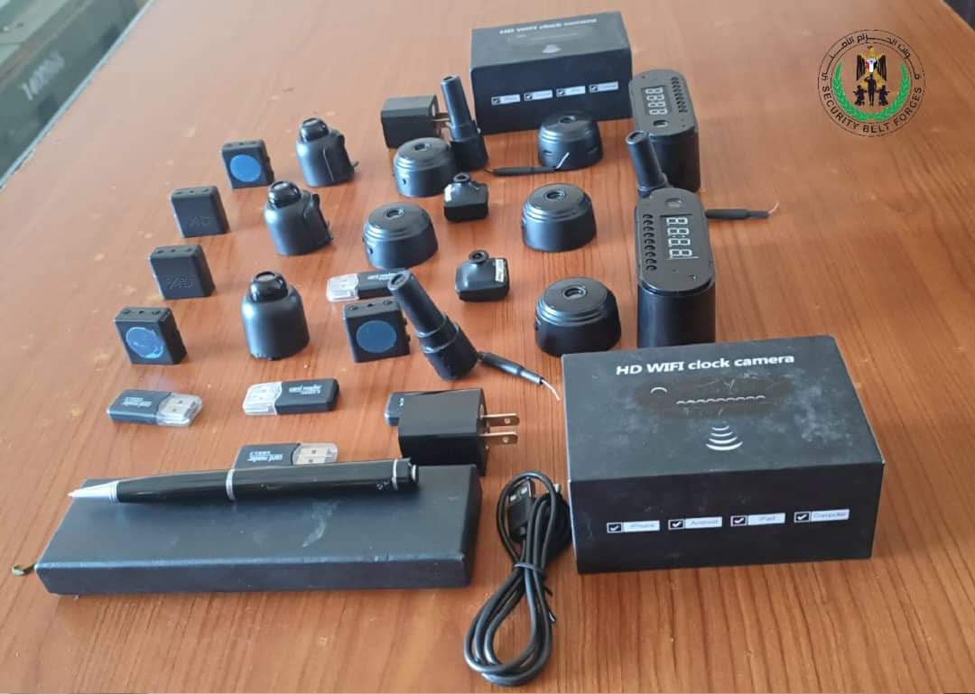 وفي التفاصيل، أوضح مصدر في عمليات حزام الطوق أن أفراد نقطة مصنع الحديد الواقعة شمال غرب العاصمة عدن، تمكنوا من ضبط 11 كاميرا تجسسية صغيرة الحجم، بالإضافة إلى كاميرات واي فاي على شكل ساعة سيارة، وقلم مزود بكاميرا، وخمسة لواقط كاميرا مع محتوياتها.