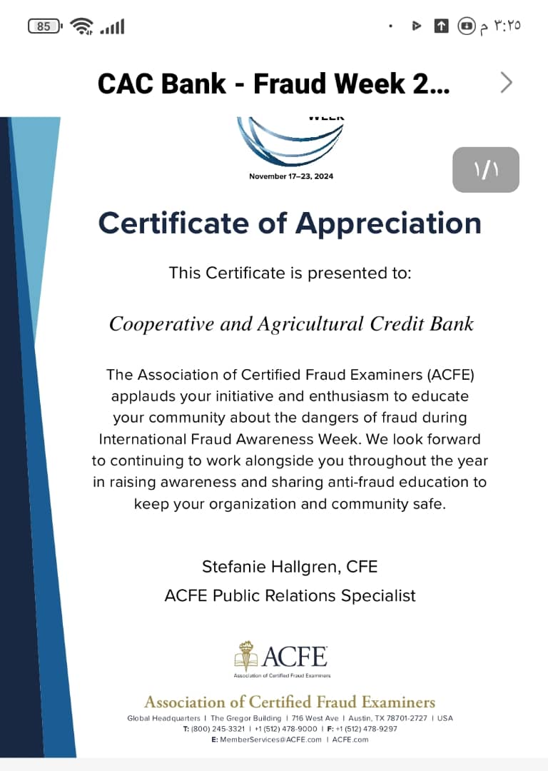 منحت جمعية فاحصي الاحتيال المعتمدين الأمريكية Association of Certified Fraud Examiners يوم أمس شهادة تقديرية لبنك التسليف التعاوني والزراعي «كاك بنك» للعام الرابع على التوالي، لجهوده والتزامه بتنفيذ فعالية الأسبوع العالمي للتوعية ضد الاحتيال خلال الفترة من 17_23 من شهر نوفمبر الماضي 2024.