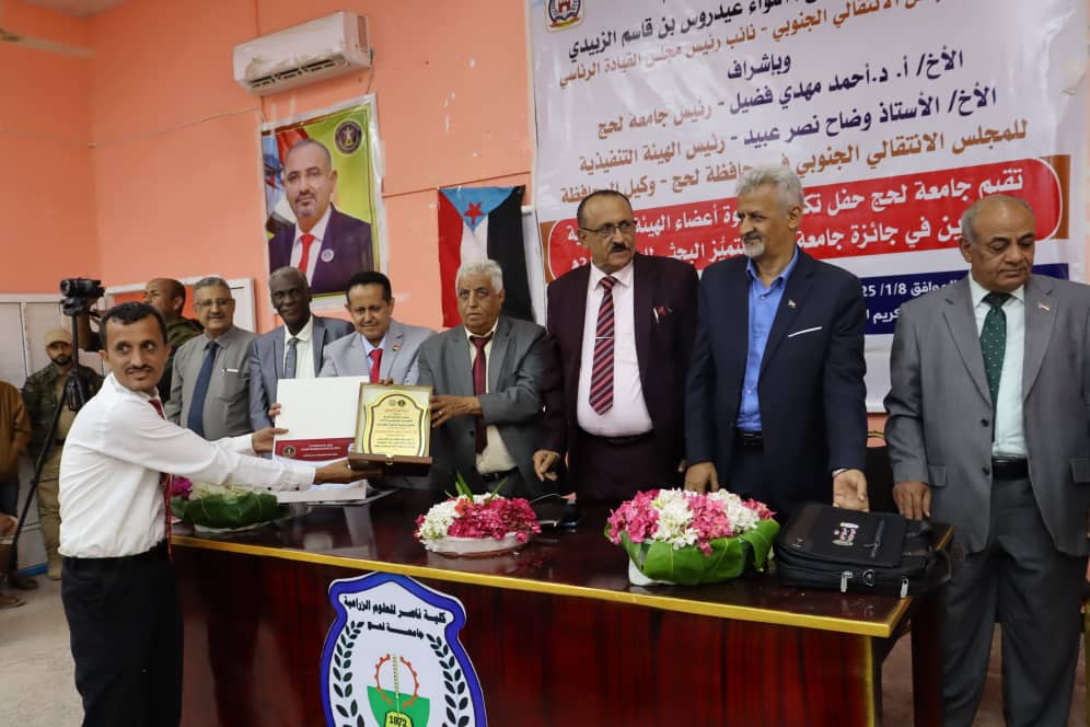 نظمت جامعة لحج اليوم بقاعة كلية ناصر للعلوم الزراعية في مدينة الحوطة بالمحافظة حفل تكريمي لإعضاء هيئة التدريسية الفائزين بجائزة التميز البحثي للعام 2024م التي نظمت بدعم ورعاية من الرئيس القائد عيدروس الزبيدي ، رئيس المجلس الإنتقالي الجنوبي وبإشراف الأخوين الاستاذ الدكتور احمد مهدي فضيل رئيس الجامعة والأستاذ وضاح نصر عبيد الحالمي ، رئيس القيادة المحلية لإنتقالي لحج