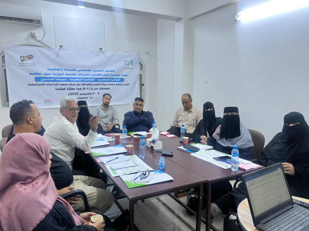 اختتمت مؤسسة أكون للحقوق والحريات خمس جلسات بؤرية حول مفاهيم ” العدالة الانتقالية – المصالحة الوطنية – سيادة القانون ” ضمن برنامج منتدى سلام اليمن وبالشراكة مع مركز صنعاء للدراسات الاستراتيجية وبتمويل من وزارة خارجية مملكة هولندا ضمن المشروع المجتمعي للعدالة والمصالحة خلال فترة 6-8 يناير 2025م.