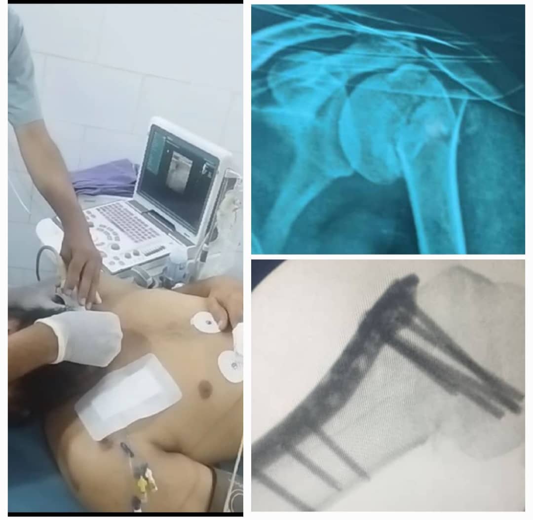 بإستخدام إحصارات الأعصاب الطرفية الموجَّهة بالموجات فوق الصوتية لتعزيز سلامة المريض وبعد التخدير تمت العملية بدقة عاليه وتعاون مشترك بين الفريق الجراحي والتخدير تم تركيب صفيحة (DHS) لتثبيت الكسر في الكتف وبعد نجاح العمليه بفضل الله ومهارة الاطباء تم نقل المريض لتلقي الرعاية الطبية نسأل الله له الشفاء العاجل