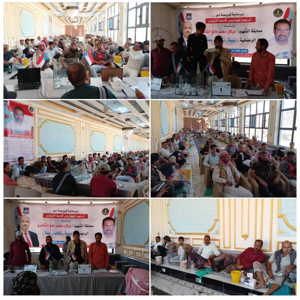برعاية الرئيس عيدروس قاسم الزبيدي رئيس المجلس الانتقالي نائب رئيس مجلس القيادة الرئاسي تم اجراء قرعة مسابقة الشهيد بركان محمد مانع الشاعري الرمضانية دينية ثقافية عامة للعام 1446 هجرية الموافق 2025 م بمشاركة 45 فريق من مختلف مديريات محافظة الضالع بحضور مدير عام قعطبة الشيخ بكر محمد مانع الشاعري في منطقة شكع مديرية الحصين وحضورمندوبي الفرق المشاركةوالقادة والشخصيات الاجتماعية من مختلف المناطق.