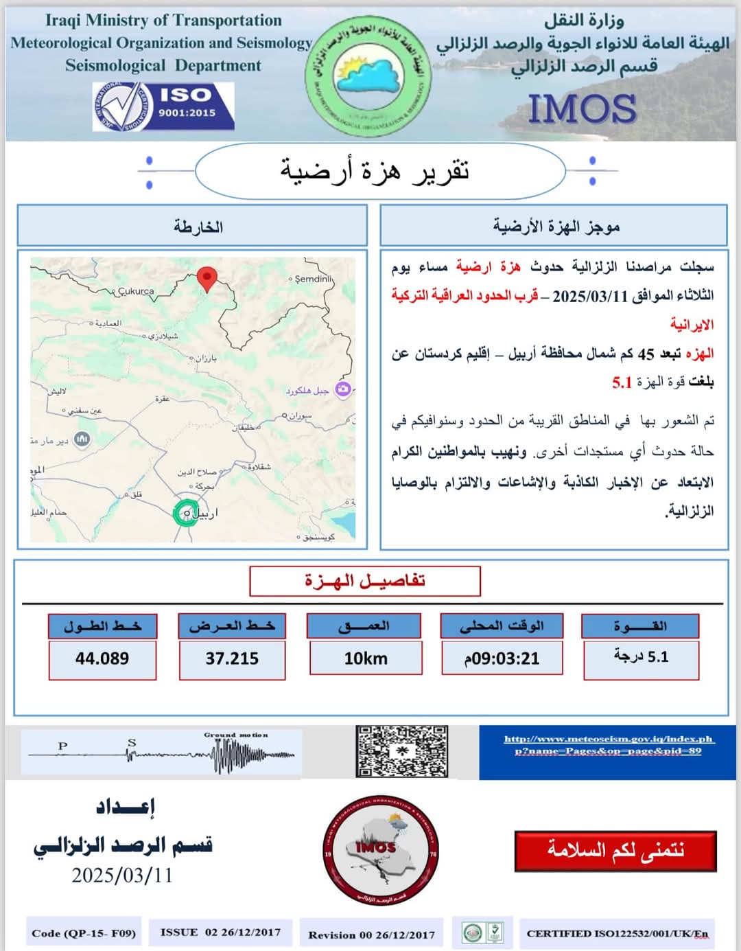 وذكرت الوزارة في بيان- تلقته وكالة الأنباء العراقية (واع)- أن “الهيئة العامة للأنواء الجوية والرصد الزلزالي التابعة للوزارة، سجلت حدوث هزة أرضية قرب الحدود العراقية – الإيرانية – التركية تبعد 45 كـم شمال مدينة أربيل بقوة (5.1) درجات وعمق 10 كم”.
