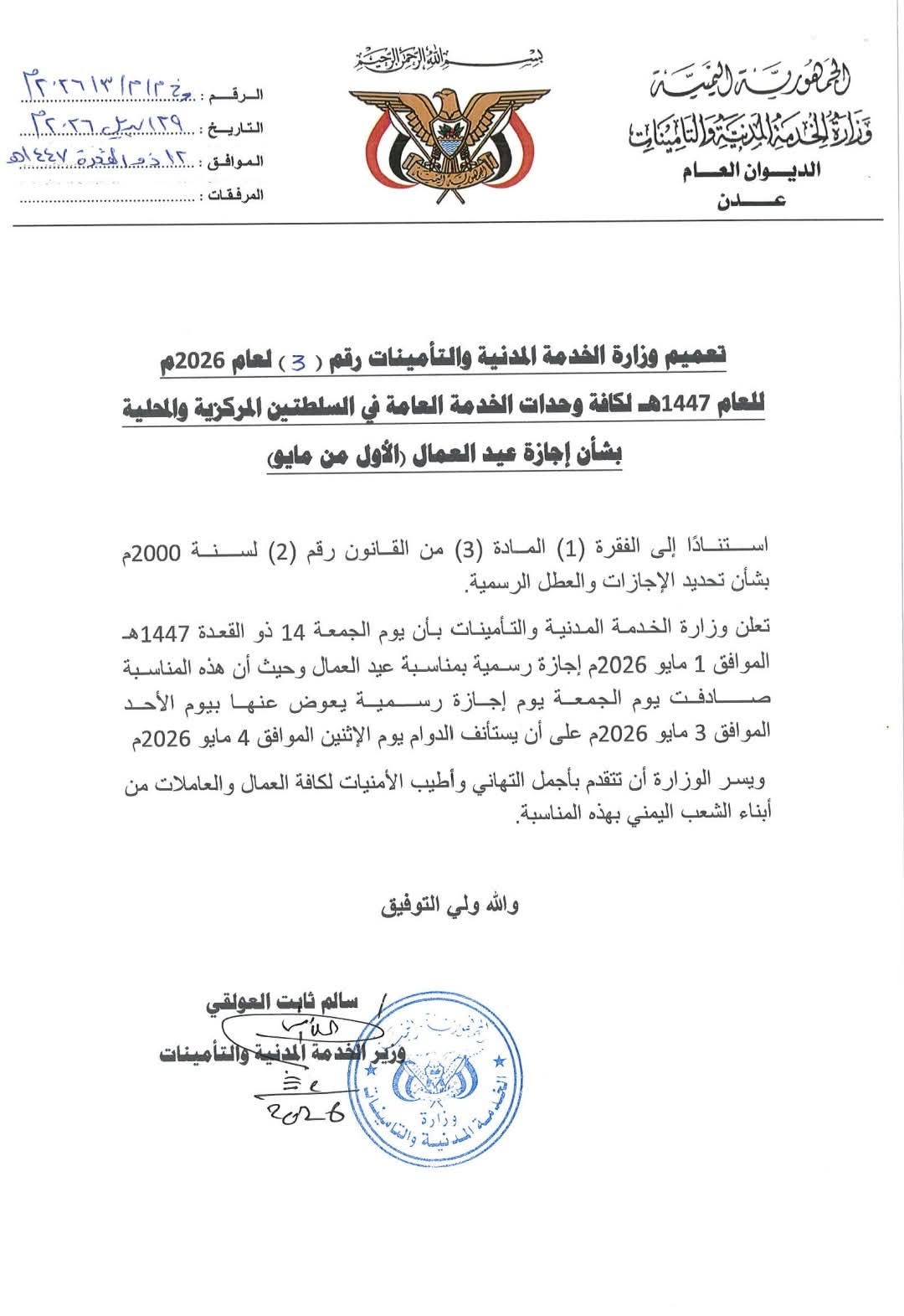أصدرت وزارة الخدمة المدنية والتأمينات قبل قليل تعميم هام حول إجازة عيد العمال .