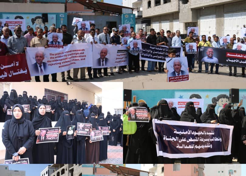 شهدت مديرية المنصورة في العاصمة عدن، اليوم ، وقفة احتجاجية نظمها معلمون و تربويون وناشطون أمام فرع مدارس “النورس” تنديدا باغتيال رئيس مجلس إدارة المدارس د/عبدالرحمن الشاعر، ومطالبة بسرعة كشف ملابسات الجريمة ومحاسبة المتورطين فيها .