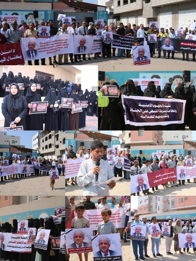 و خلال الوقفة الاحتجاجية السلمية ألقى ابن الشهيد الأستاذ /خالد الشاعر كلمة عبر فيها عن حزنه الشديد قائلا : بأن اغتيال والده يشكل جرحا عميقا في وجدان أفراد أسرته و المجتمع، مؤكدا رفضهم أي محاولات لتطبيع العنف أو استهداف الكوادر التعليمية. وطالب ابن الشهيد مجلس القيادة الرئاسي بتحمل مسؤولياته في حماية الأرواح، وكشف ملابسات الجريمة بسرعة، واتخاذ إجراءات صارمة لضمان محاسبة الجناة وتعزشيز هيبة الدولة وسيادة القانون.