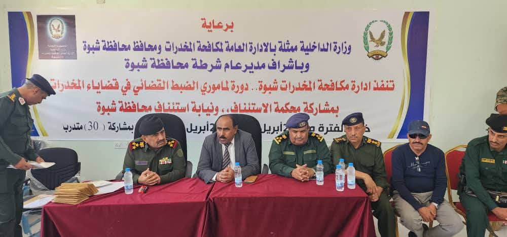 اختتمت إدارة مكافحة المخدرات بشرطة محافظة شبوة، وبالتعاون مع الإدارة العامة لمكافحة المخدرات بوزارة الداخلية، اليوم الخميس، الدورة التدريبية التخصصية لمأموري الضبط القضائي في قضايا المخدرات، والتي استهدفت 30 متدرباً من منتسبي شرطة المحافظة، بمشاركة محكمة الاستئناف ونيابة الاستئناف بمحافظة شبوة.