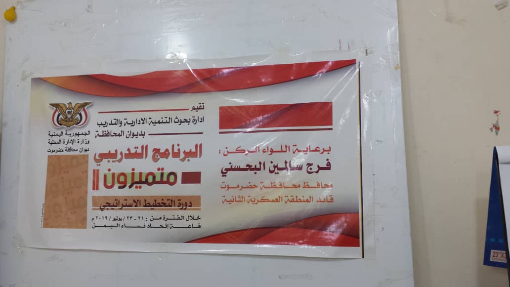 *والذي يأتي برعاية كريمة من اللواء الركن/فرج سالمين البحسني محافظ محافظة حضرموت قائد المنطقة العسكرية الثاني وبتنفيذ من قبل إدارة بحوث التنمية الإدارية والتدريب بديوان محافظة حضرموت .*