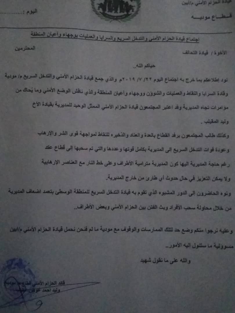 – عودة قوات التدخل السريع بكامل قوتها وعتادها الى مديرية مودية والتي تم سحبها الى قطاع عكد رغم حاجة المديرية اليها كونها مترامية الاطراف وعلى خط النار مع العناصر الارهابية وصعوبة التعزيز في حالة الطوارئ خارج مركز المديرية.