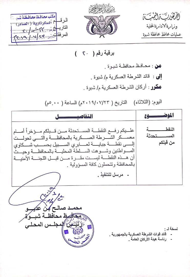 وجاء بالبرقية بأن عليكم رفع النقطة المستحدثة من قبلكم موخرآ أمام معسكر الشرطة العسكرية بالمحافظة والتي تحولت إلى نقطة جباية لعابري السبيل بحسب شكاوي المواطنين وشوهت السلطة المحلية بالمحافظة حيث إن هذه النقطة ليست مقرة من قبل اللجنة الأمنية بالمحافظة وتتحملون كافة المسئولية.