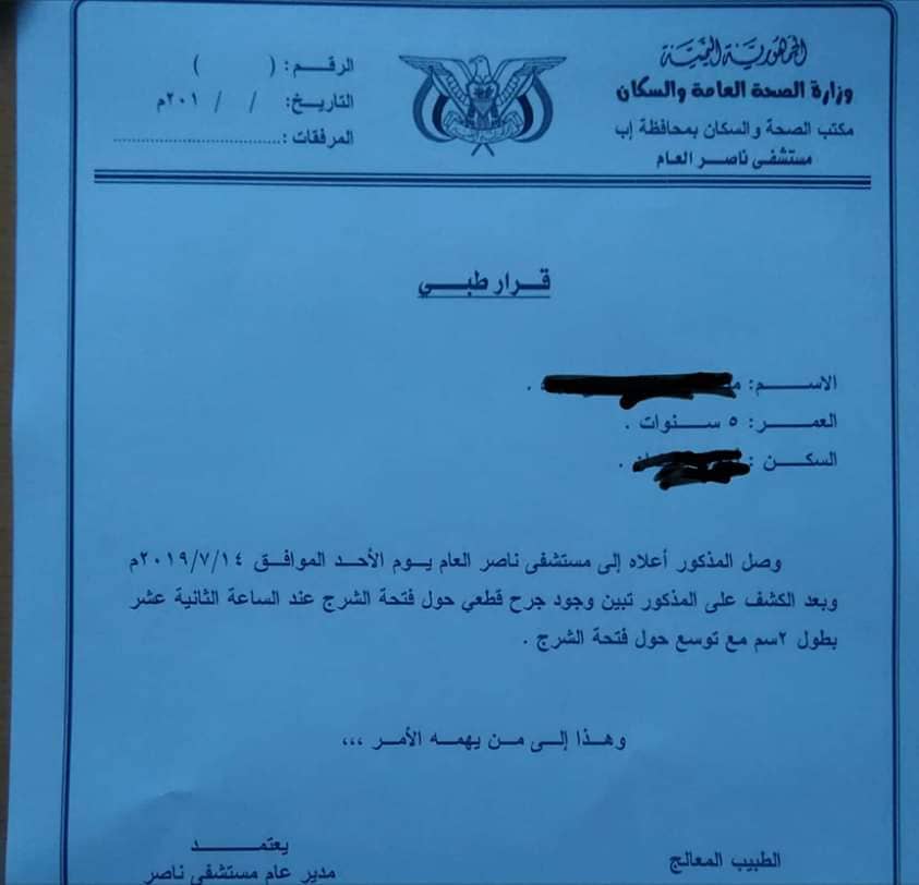 وأكد تقرير طبي – حصل “يمن الغد” على نسخة منه – تعرض الطفل للاغتصاب بصورة مروعة.