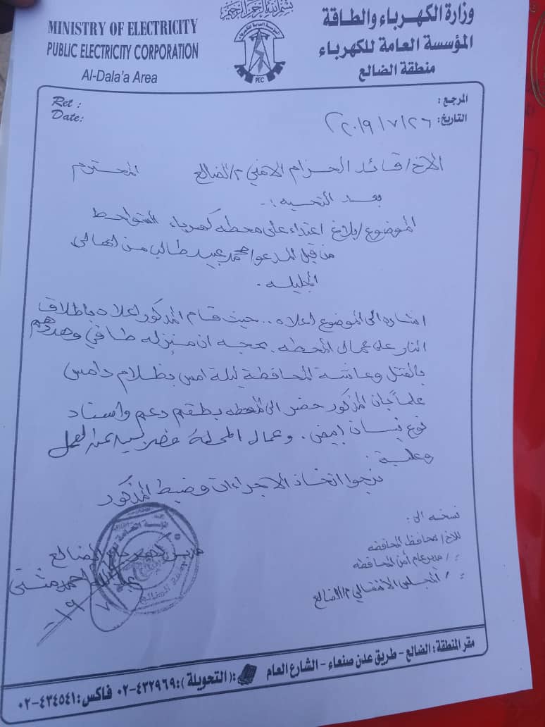 وفي بلاغ مقدم الى قائد الجزام الأمني من ادارة منطقة كهرباء الضالع شكو فيه اقدام المدعو محمد عبيد طالب من اهالي الجليلة على اطلاق النار على عمال محطة الشواحط وتهددهم بالقتل مستخدما” في ذلك طقم عسكري دعم واستاد نوع نيسان لونه ابيض الامر الذي ادى الى اطفاء المحطة ومغادرة العمال واعلان الاضراب .