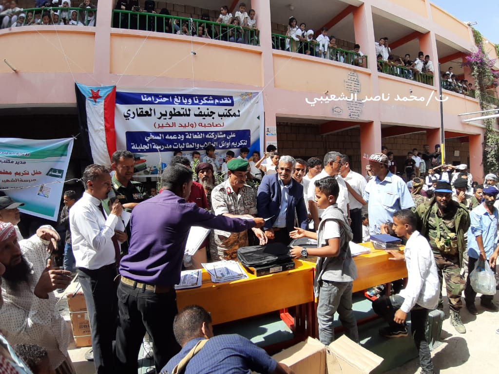أقيم صباح اليوم الاربعاء 9 أكتوبر 2019 في مدرسة الشهيد / صالح عنتر الجليلة الضالع حفل تكريمي كبير لمعلمي و أوائل الطلاب برعاية المهندس /وليد الخير مدير مكتب جنيف للتطوير العقاري الذي كان في مقدمة الحضور.