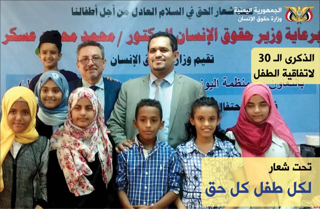 برعاية الوزير محمد عسكر تنظم وزارة حقوق الإنسان وبالشراكة مع منظمة اليونيسف تشهد قاعة فندق كورال بالعاصمة المؤقتة عدن صباح يوم غدا الأحد الموافق 24 نوفمبر 2019 م التاسعة صباحا فعالية احتفالية كبرى بمناسبة اليوم العالمي لحقوق الطفل 2019م والذكرى الثلاثين لاتفاقية حقوق الطفل .