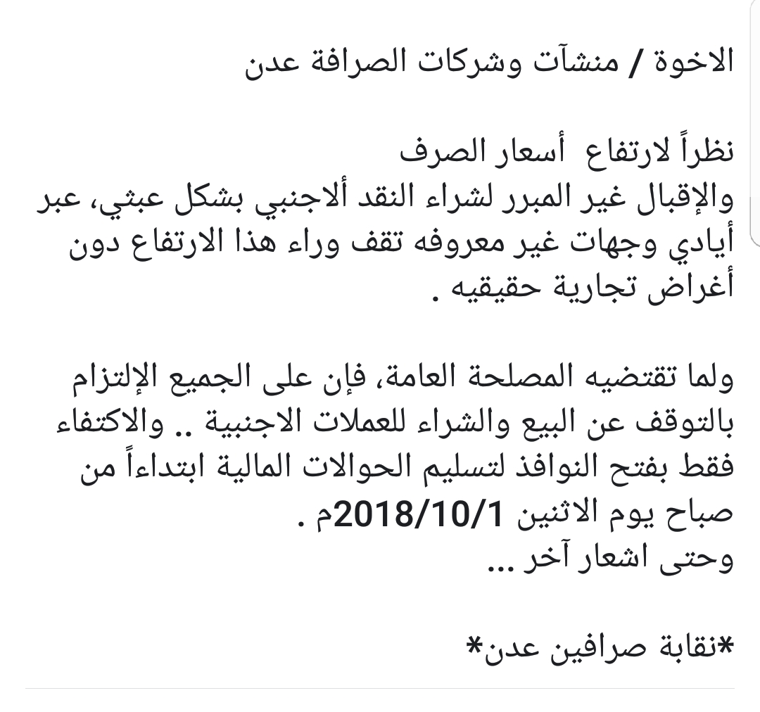 أصدرت نقابة الصرافين بالعاصمة عدن قبل قليل تعميم هام وعاجل لجميع محلات وشركات الصرافة بالمدينة ، للتوقف عن عمليات البيع والشراء بالعملات إبتداءاً من صباح غد الإثنين وحتى إشعار آخر.