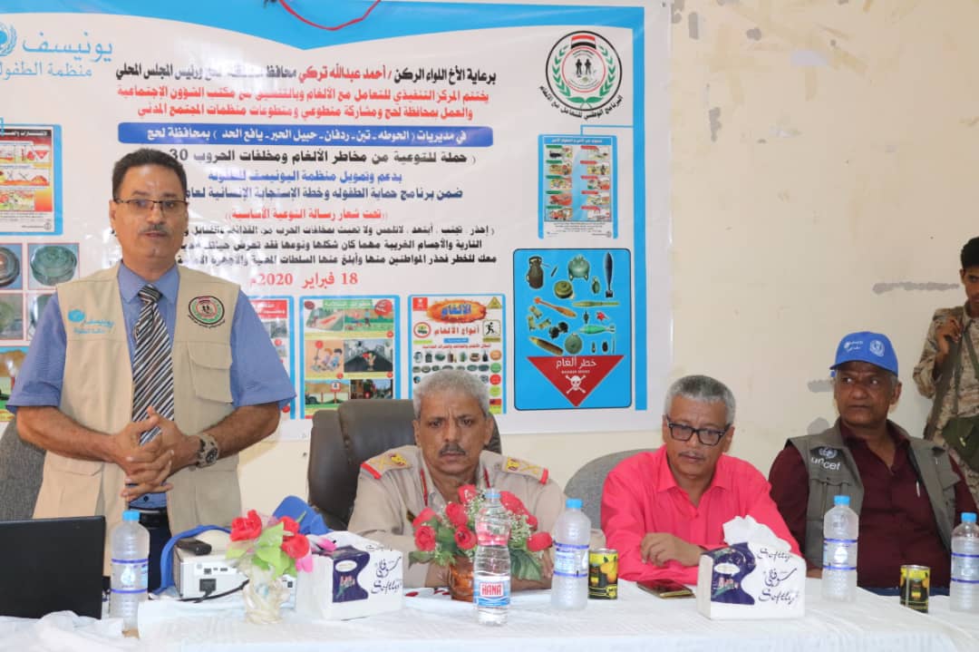 واشاد محافظ لحج في كلمة له بأهمية البرنامج التوعوي ضد مخاطر الألغام وتنفيذه في المحافظة في ظل ما تشهده البلاد من حالة حرب وما تعانيه المحافظة من مخلفات الألغام والتي زرعها الحوثيين بطريقة عشوائية وفي مناطق لا توجد لها خرائط مما يزيد من مخاطر إصابة المواطنين الامنين في مناطقهم وقراهم النائية.