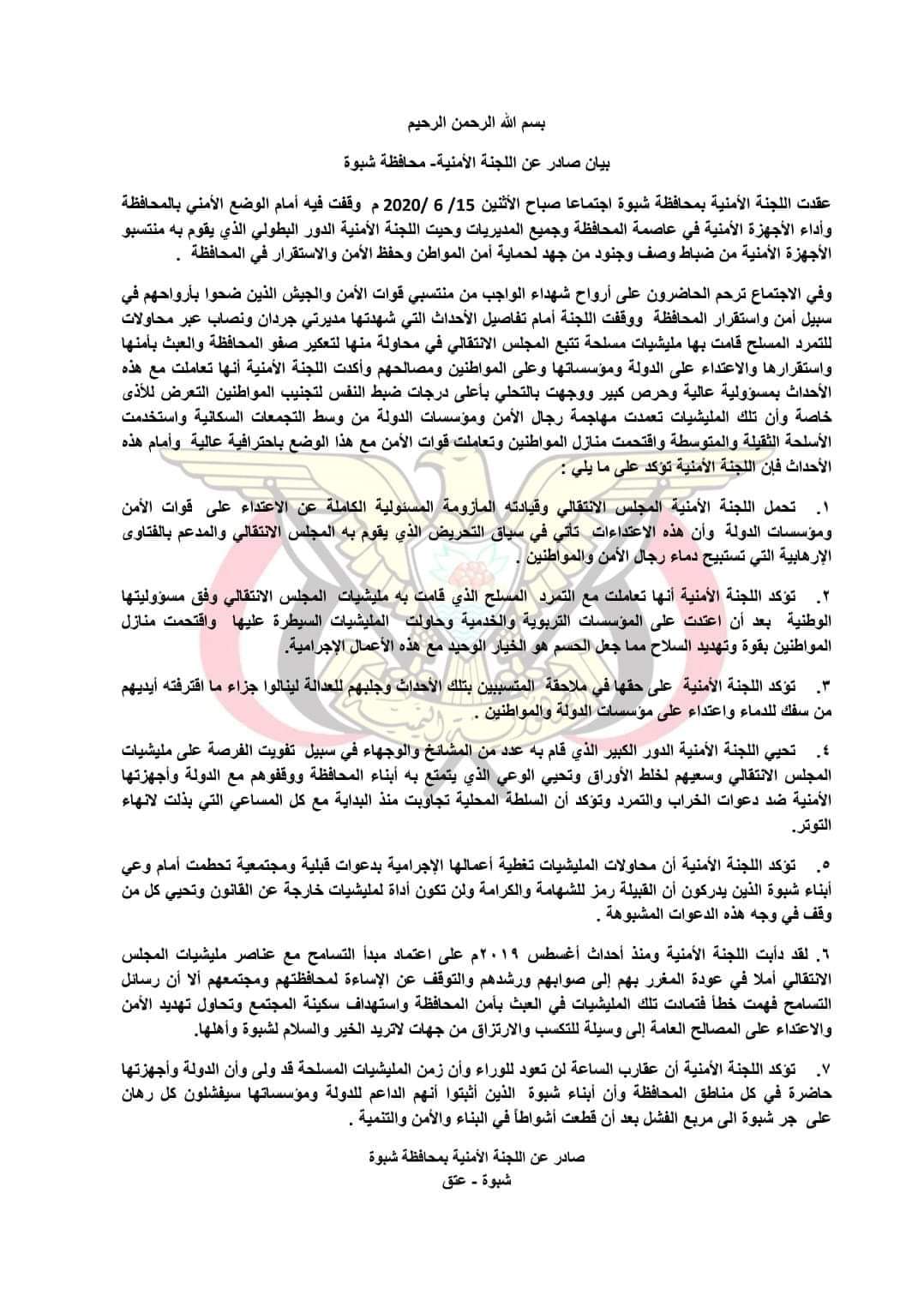 1- تحمل اللجنة الأمنية المجلس الانتقالي وقيادته المأزومة المسئولية الكاملة عن الاعتداء على قوات الأمن ومؤسسات الدولة وأن هذه الاعتداءات تأتي في سياق التحريض الذي يقوم به المجلس الانتقالي والمدعم بالفتاوى الإرهابية التي تستبيح دماء رجال الأمن والمواطنين .