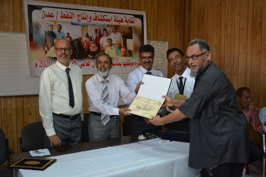 نظمت نقابة هيئة استكشاف وانتاج النفط في العاصمة عدن ، صباح اليوم ، حفلا تكريمياً لعدد ( 60 ) موظفاً وموظفة من العاملين المبرزين والمتميزين في الهيئة وفرعها في عدن وذلك بحضور ومشاركة عمال وموظفي الهيئة .