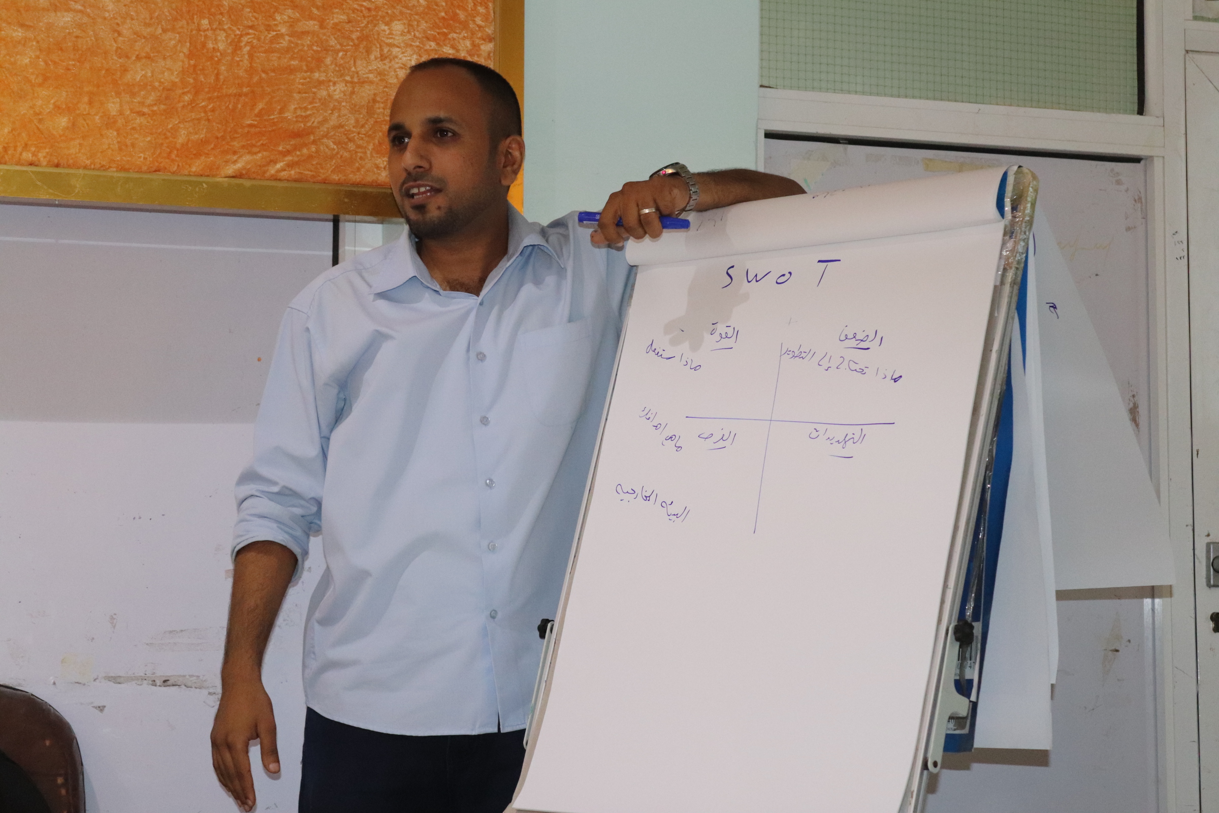 المدرب والاستشاري معين الشعبي اوضح بأن المشاركين بالورشة سيتلقون تدريب حول كيفية اعداد التخطيط الاستراتيجي في مجال الصحة لاستخدام أداة SWOT بتحليل للخطة كون المخاطر الصحية تتغيير بناء على ظروف ومستجدات صحية جديدة .