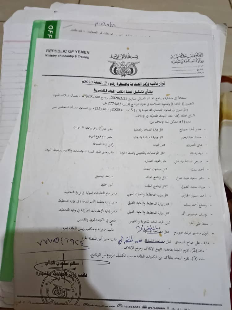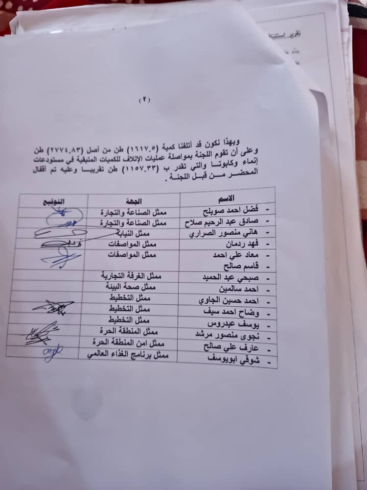 واضاف صويلح علي ضوء، ذلك رفعت اللجنة تقريرا الى معالي نائب وزير الصناعة ومعالي نائب وزير التخطيط ، حددت فيه الكميات التي انتهت صلاحيتها والكميات المقربة صلاحيتها في 1.4.2020 واجتمعت قيادة الوزارة مع ممثلي البرنامج ووزارة التخطيط بشأن طلب اتلاف كمية تقدر ب2774.83 طن منها 1617 طن في المنطقة الحرة والباقي موزع في مستودعات الصباري وانماء والخضراء وبن مقيبل.