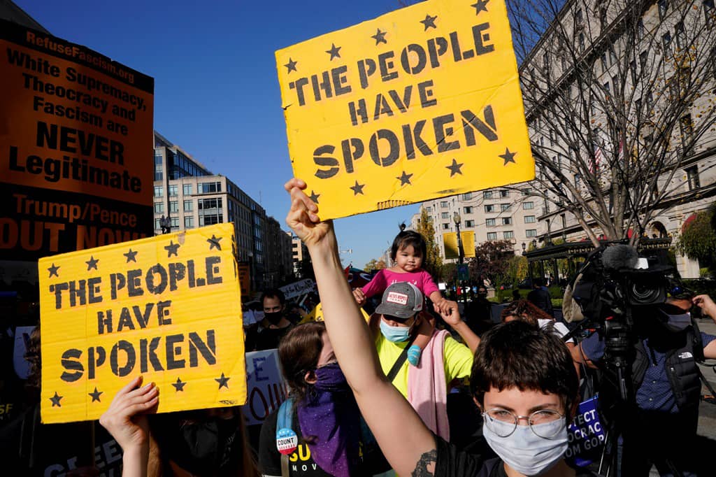 (يعتقد اثنان من بين كل ثلاثة أشخاص في الحزب الجمهوري، وهم على خطأ، بأنّ تزوير الانتخابات بشكل واسع النطاق ربما جعل كفّة انتخابات 2020 تميل إلى صالح جو بايدن، وهي رواية اختلقها الرئيس بنفسه وسمح لها قادة الحزب الجمهوري في الكونغرس أن تكتسب زخماً عبر عدم تحركهم لصدّها).