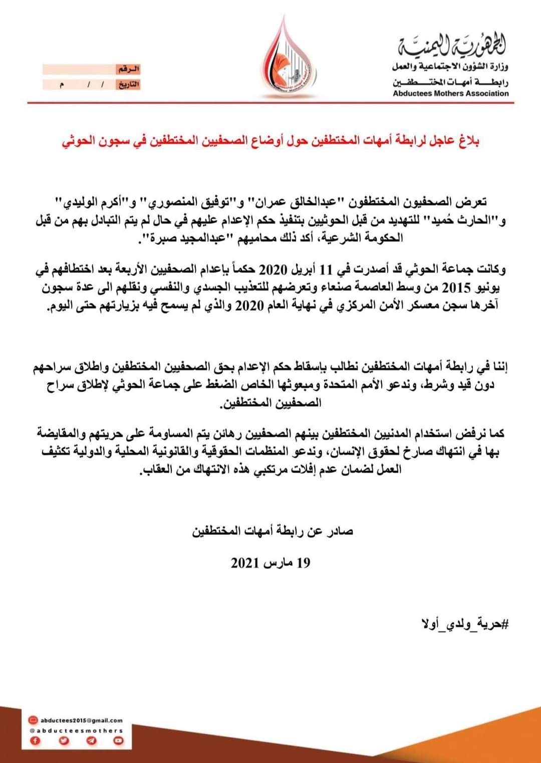 أصدرت رابطة أمهات المختطفين بلاغاً عاجلاً حول ما يتعرض له أربعة صحفيين مختطفين من قبل المليشيات الحوثية بصنعاء .