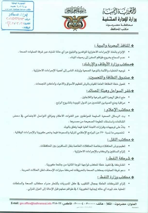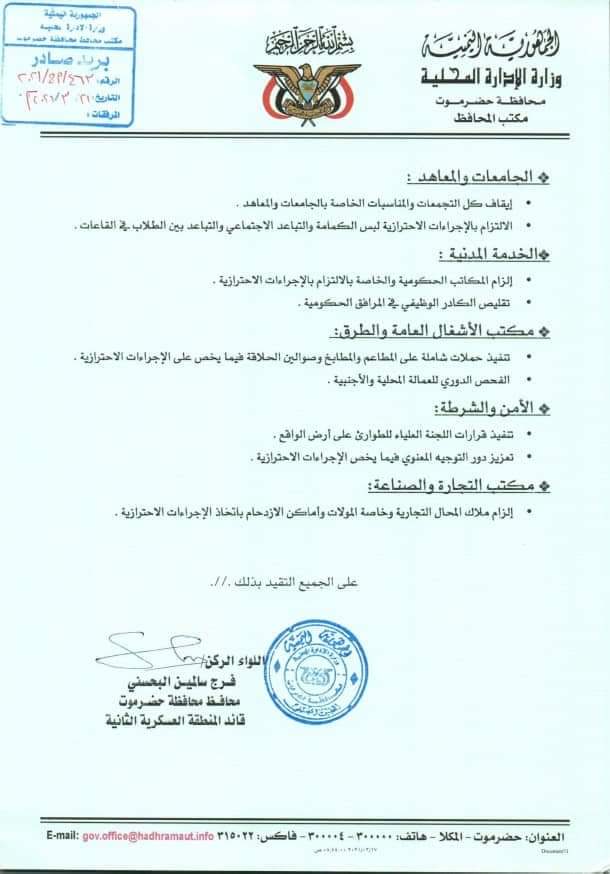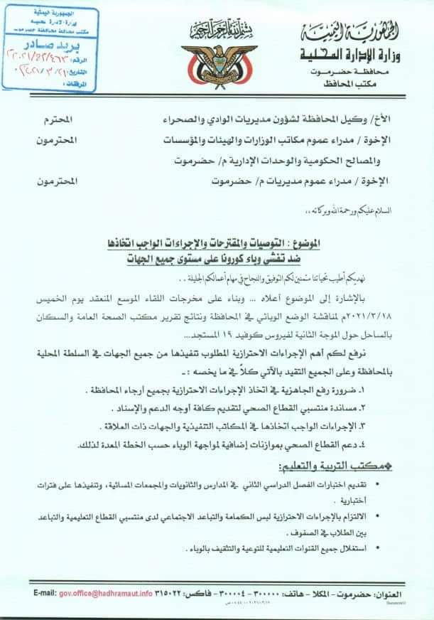 وجه محافظ حضرموت قائد المنطقة العسكرية الثانية اللواء الركن فرج سالمين البحسني، بعدد من الاجراءات الواجب اتخاذها ضد تفشي وباء كورونا على مستوى جميع الجهات بالمحافظة، وذلك بناء على مخرجات الموسع المنعقد بالمكلا يوم الخميس 18 مارس 2021م، لمناقشة الوضع الوبائي بالمحافظة، ونتائج تقرير مكتب الصحة العامة والسكان بالساحل حول الموجة الثانية لفيروس كوفيد ١٩ المستجد.