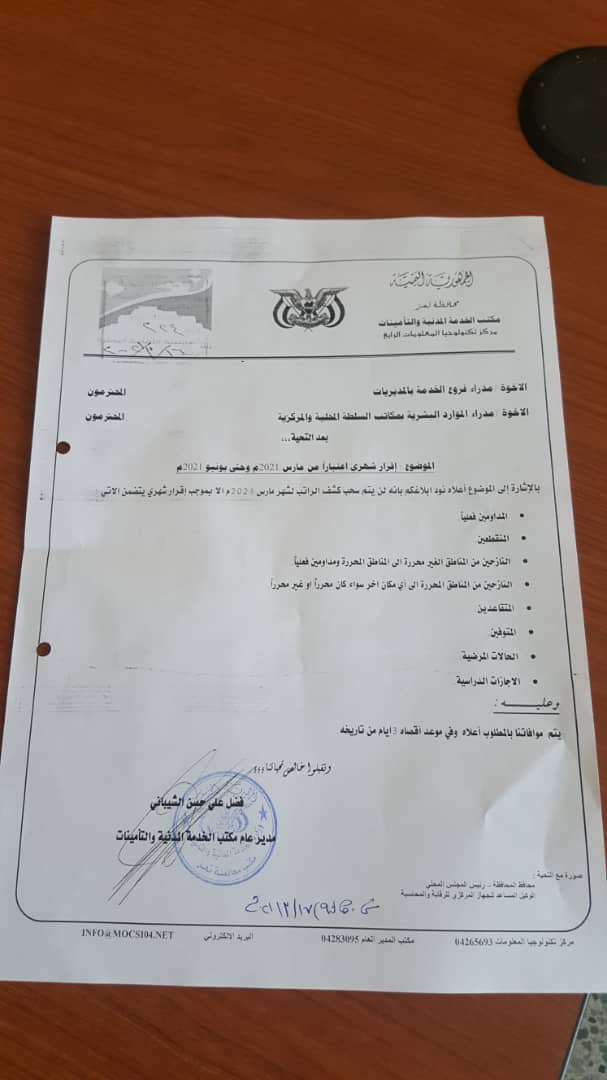 وفي ذات الصدد شرعت الخدمة المدنية في المحافظة على اتخاذ خطوات التنفيذ لاكبر مذبحة في حق موظفي الدولة مستندة لمقررات غير قانونية دشنها المحافظ نبيل شمسان بعيد اعلان النفير العام تقضي بخصم رواتب كبار موظفي الدولة لمدة ثلاثة اشهر لصالح الدعم والاسناد