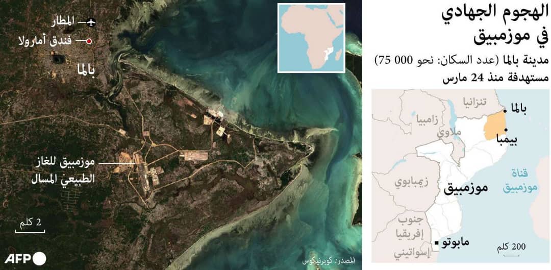 وأعلن رئيس موزمبيق فيليب نيوسي الأربعاء أن الجهاديين “طردوا” من مدينة بالما. لكنه امتنع عن إعلان النصر بينما تكافح البلاد منذ أكثر من ثلاث سنوات مقاتلين إسلاميين معروفين محليا باسم الشباب في مقاطعة كابو ديلغادو الفقيرة والغنية بالغاز الطبيعي. وقال “لا نعلن النصر لأننا نكافح الإرهاب”.