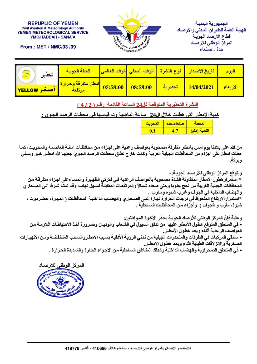أصدر المركز الوطني للأرصاد اليمنية قبل قليل من صباح اليوم الاربعاء النشرة التحذيرية المتوقعة لحالة الطقس المتوقع خلال الـ 24 ساعة القادمة في مختلف مناطق الجمهورية.